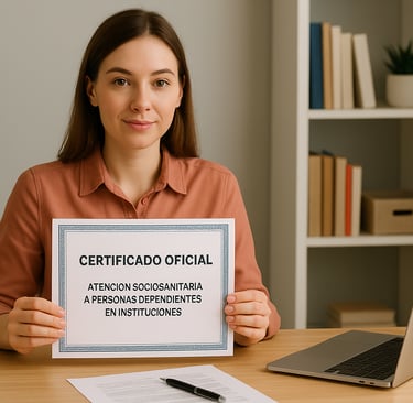 El certificado oficial en Atención Sociosanitaria a Personas Dependientes en Instituciones es una acreditación profesional reconocida por el SEPE y las Comunidades Autónomas que certifica tus competencias para atender, cuidar y acompañar a personas mayores o en situación de dependencia en centros especializados, como residencias, centros de día o instituciones sociales.